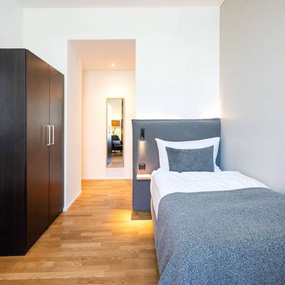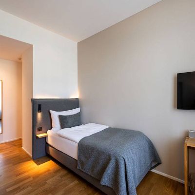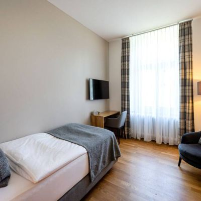 Das modern eingerichtete Einzelzimmer Deluxe (17 m²) bietet eine stilvolle Atmosphäre mit hochwertigem Echtholzparkett, das dem Raum eine warme und einladende Note verleiht. Das Zimmer ist mit einem komfortablen Bett (90x200 cm) ausgestattet, das für erholsame Nächte sorgt. Die grosszügige Ausstattung umfasst zudem ein eigenes Bad mit Dusche und Toilette, sodass Sie sich rundum wohlfühlen können. Zur Unterhaltung stehen Ihnen ein Fernseher und ein Radio zur Verfügung, um den Aufenthalt noch angenehmer und entspannter zu gestalten. Dieses Zimmer bietet die perfekte Kombination aus modernem Komfort und Ruhe für einen unvergesslichen Aufenthalt